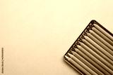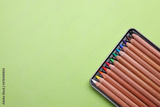 Box with many colorful pastel pencils on light green background, top view and space for text. Drawing supplies