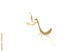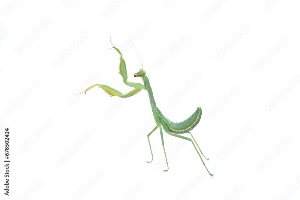 Green praying mantis nymph stands, looks at the camera and rises its legs up. Macro shot of insect in the studio. Mantis isolated on white. Close up high key photo