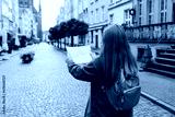 Portrait redhead woman with paper map on urban street. Happy tourist travels in Europe. Vacation concept by exploring interesting places to travel. 30s Woman Searching locations at autumn day, Gdansk