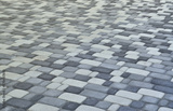 A detailed photo of the square, laid out of modern paving stone with rounded corners. Accurate design of pedestrian areas