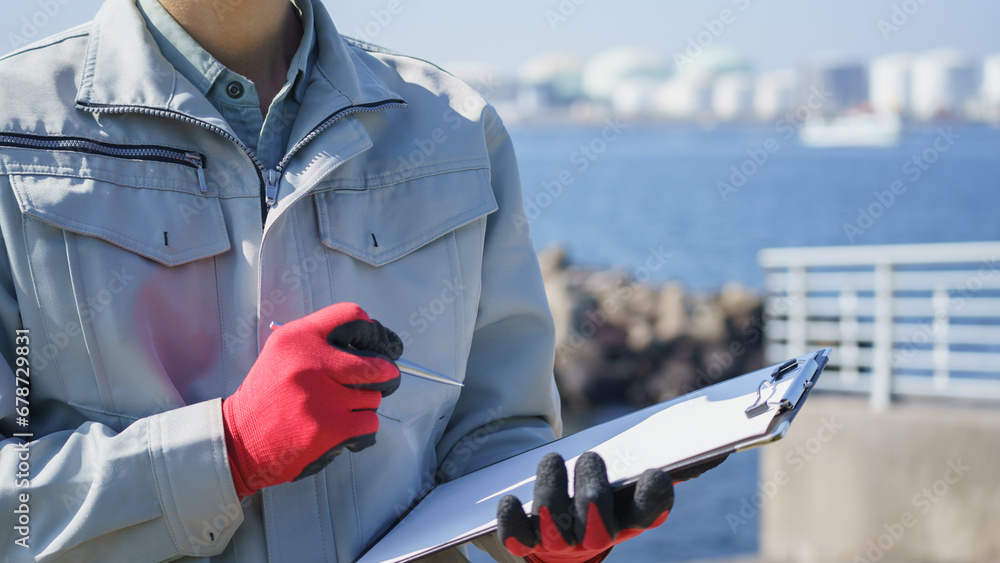 クリップボードを持つ作業服の男性・海と工業地帯│建設業・製造業・プラント イメージ