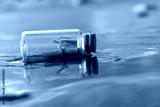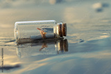 Close-up photograph of a miniature bottle containing a message. The bottle is on a beach at sunrise.