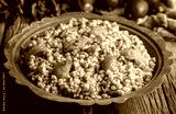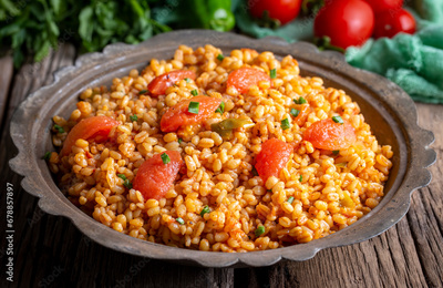 Traditional turkish bulgur pilaf with tomato sause in plate (Turkish name; meyhane pilavi)