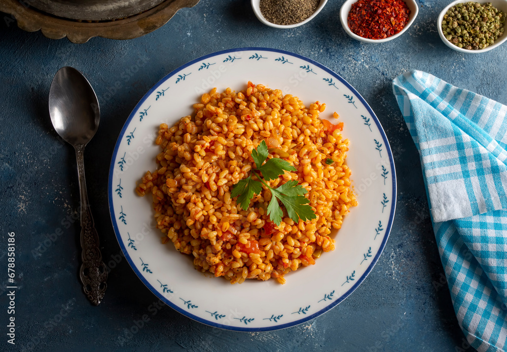 Traditional turkish bulgur pilaf with tomato sause in plate (Turkish name; meyhane pilavi)