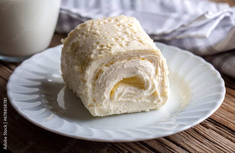 Turkish creamy dairy product. Clotted cream (butter cream) for Turkish breakfast with glass of milk. (Turkish name; kaymak)
