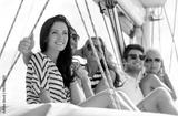 smiling friends sitting on yacht deck