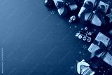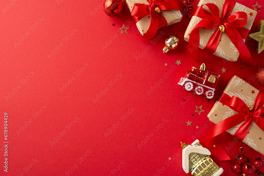 Deck the halls with festive flair. Overhead shot of earthy gift boxes, red and gold baubles, whimsical Christmas tree ornaments, mistletoe, confetti, arranged on a vibrant red surface with text space
