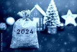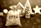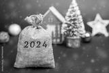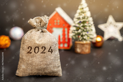 Money bag 2024, Christmas tree and red house. Merry Christmas and Happy New Year! Xmas concept. Accumulating money and planning a budget. Business and finance. Loans, deposit, credit.