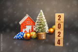 Blocks 2024, Christmas tree and red house. Merry Christmas and Happy New Year! Xmas concept. Festive winter holiday. Snowfall