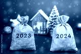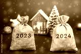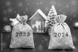 Bags 2023, 2024 in the background of a New Year tree, a house and snow. Concept of financial savings and money management. Profit analysis and budget planning for the new year. Business and finance
