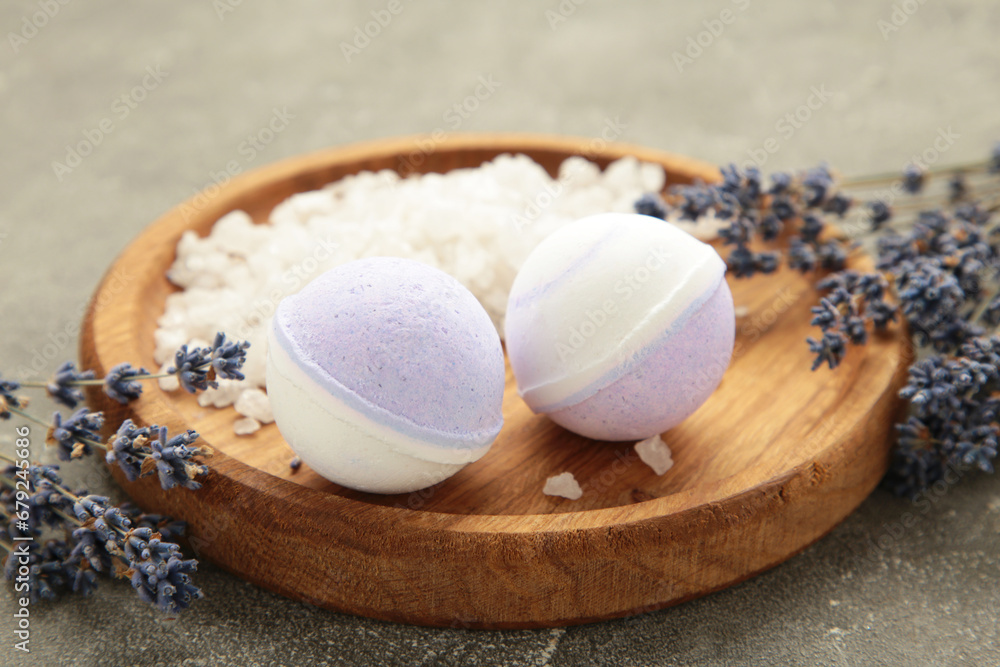 Natural cosmetics. Handmade lavender bath bombs and lavender flowers on wooden board.