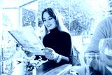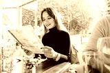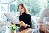 Young woman reading menu sitting with friend at casual cafe. Smiling woman checking menu, choosing meal or drink, making order. Try new foods while traveling. real people. copy space. Selective focus.