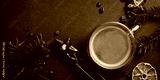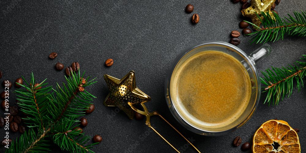 A cup of coffee on a table with New Year and Christmas decorations. Top view, on a black background, free copy space. Holiday.