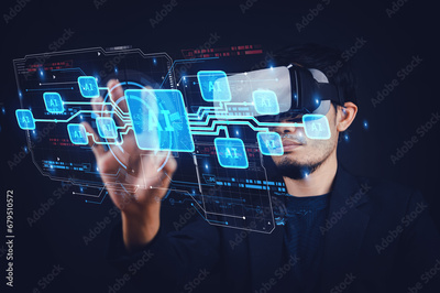 Man uses VR glasses connected to AI Artificial intelligence to work efficiently
