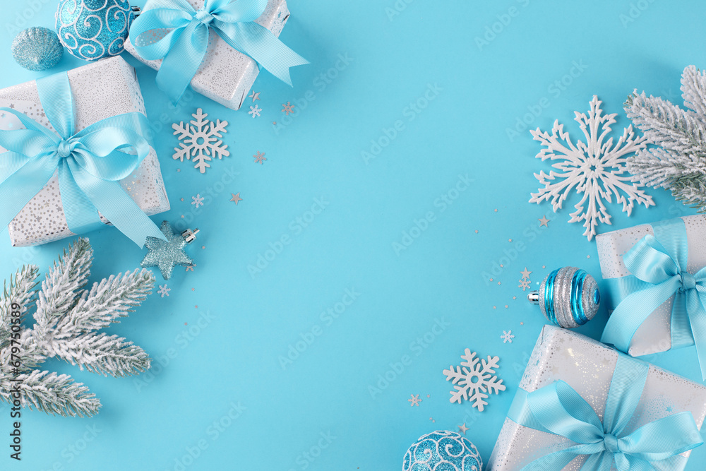 Set the tone for the New Year with considerate gift choices. Top view photo of present boxes, frosty fir twigs, yule tree ornaments, snowflakes, stars on blue background with ad space