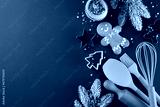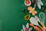 Producing seasonal treats concept. Top view composition of sweet cookies, candies, baking tools, baking tins, frosty fir twigs, stars on green background with advert panel
