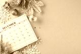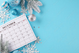 Time to get ready for the New Year celebrations. Top view flat lay of calendar, frosty fir twigs, yule tree ornaments, snowflakes, stars on blue background with advert placeholder