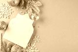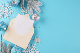 Spread the holiday joy by sending out your Xmas party invitations. Top view shot of envelope with card, frosty fir twigs, yule tree ornaments, snowflakes, stars on blue background with promo zone