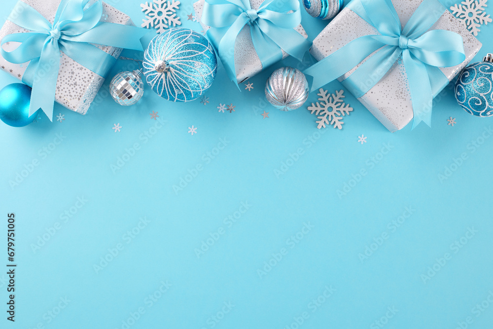 Uncover the enchantment of discovering the perfect Christmas surprises. Top view flat lay of elegant presents, xmas decorations, snowflakes, stars on blue background with marketing space