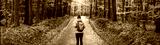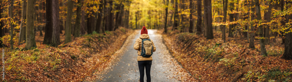Woman hiking in autumn forest. Female hiker with backpack walks on road in woodland. Panoramic view