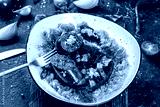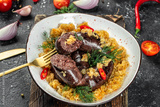 Bloody sausage and sauerkraut in bowl on a dark background. top view. copy space for text