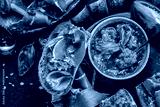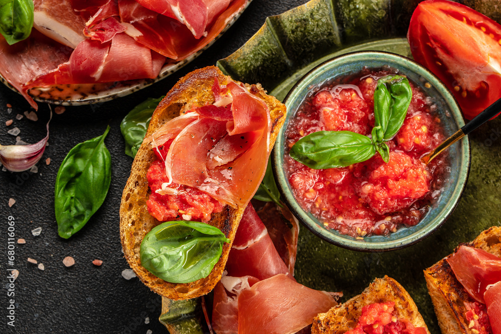 typical Spanish breakfast Jamon Iberico ham and tomatoes, olive oil bread. top view