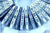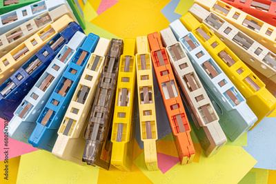 Top view of a collection of old vintage retro multicolored audio tape cassettes with a background of multicolored paper sticky notes