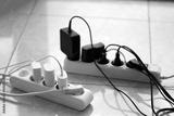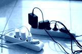 Overloaded power boards. Power strips with different electrical plugs on white floor. Concept of risk danger overloaded current electrical