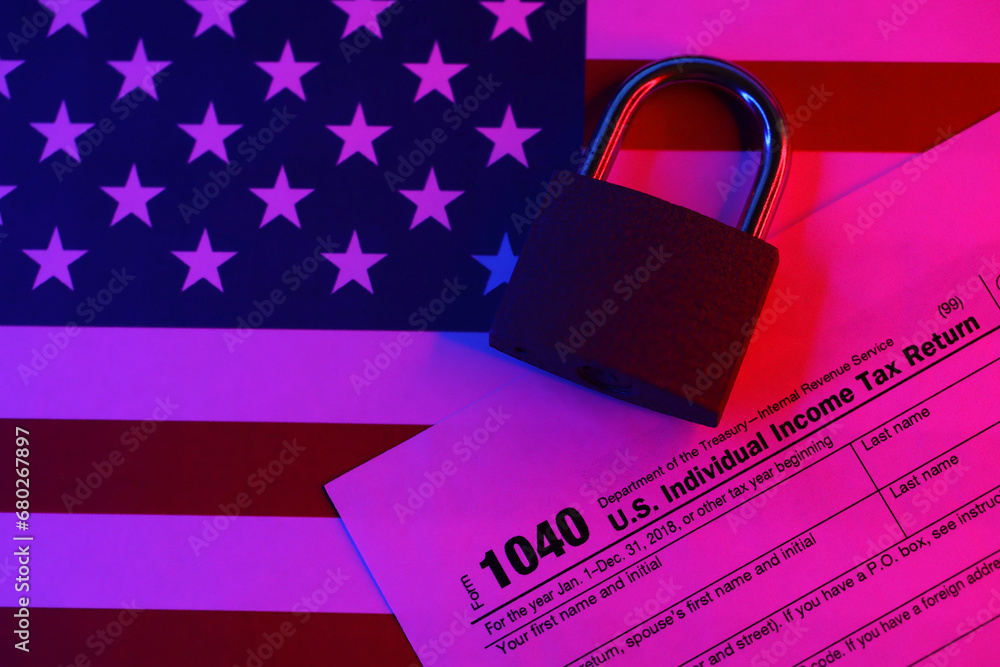 1040 US Individual Income Tax Return form with small locked padlock. Sanctions or blocked tax operations in United States
