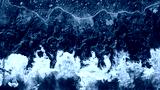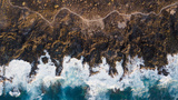 Drone view of Tenerife south coast with Atlantic ocean and strong swell beating against the walls of a rocky cliff, blue rough sea with big waves with foam crashing against the rocks