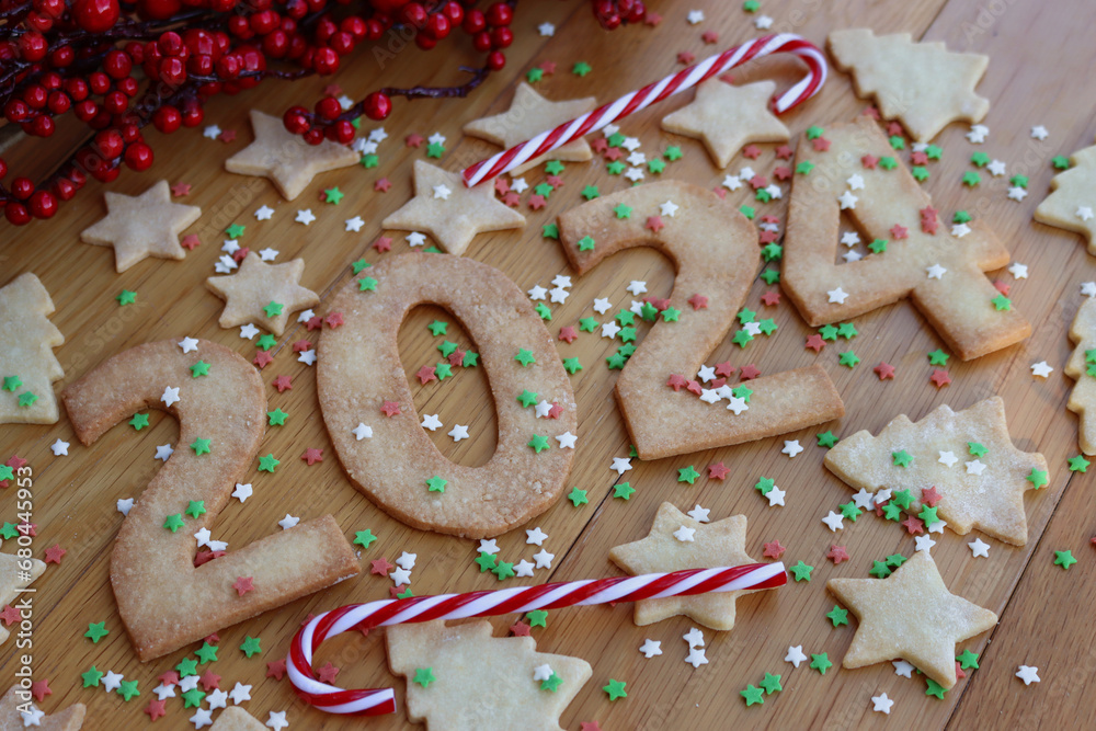 Shortcrust cookies in the form of numbers 2024 with festive cookies in shape of star and tree with colorful sprinkles with candy canes on wooden table