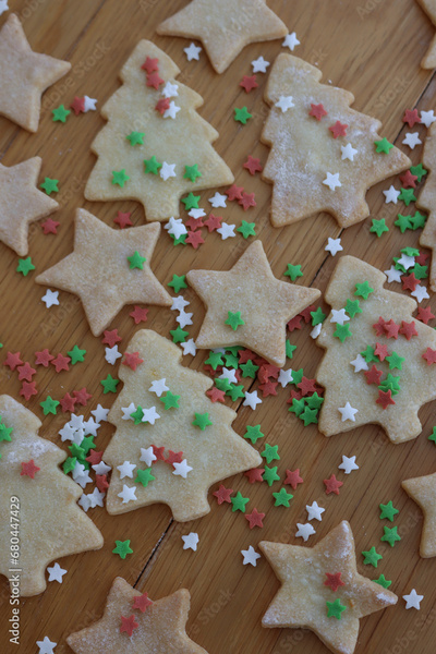 Christmas cookies in shape of star and tree on wooden table with green, red and white star shaped sprinkles. Christmas festive background on selective focus