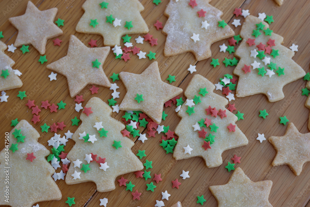 Christmas cookies in shape of star and tree on wooden table with green, red and white star shaped sprinkles. Christmas festive background on selective focus