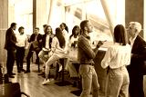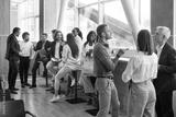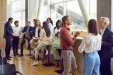 Full length photo of a group of diverse business people men and women chatting after meeting. Company employees or group of staff talking in modern office or conference room discussing work project.