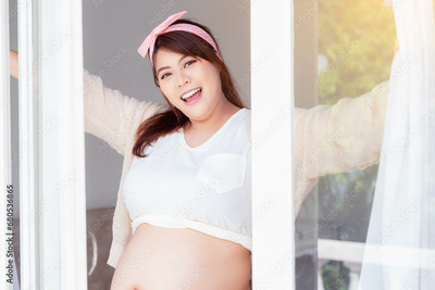 Asian happy pregnant woman standing near window and open curtain in the morning Pregnancy girl just wake up in the morning and get fresh air Pregnancy motherhood Health care and expectation concept