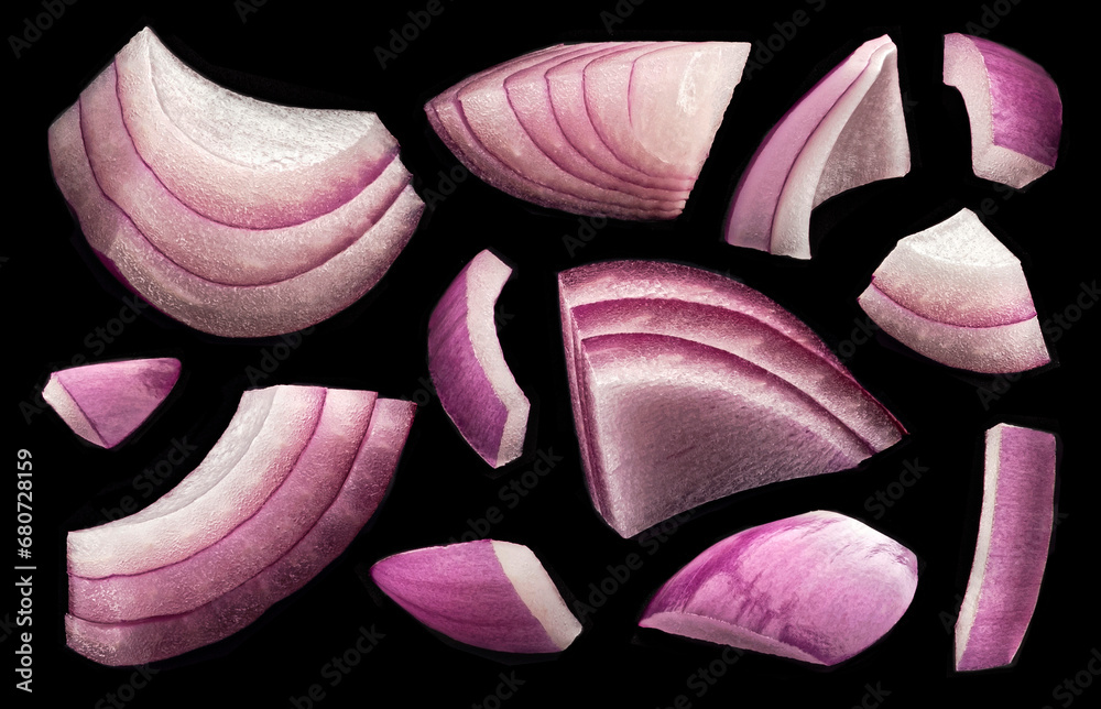 Sliced red onion isolated on black background