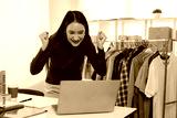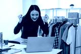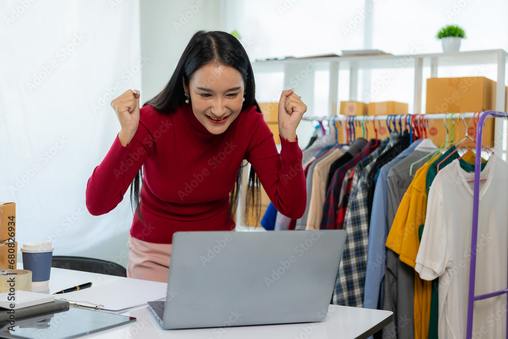 Online digital business, SME, small business New startup for online stores A happy and excited Asian woman has a place to deliver goods to customers, an SME business owner.