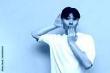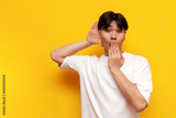 shocked young asian guy in white t-shirt overhearing secret information on yellow isolated background