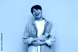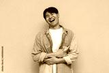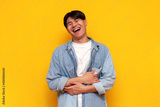 asian guy in denim shirt laughing and mocking on yellow isolated background, korean man laughing and joking