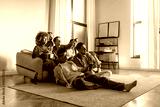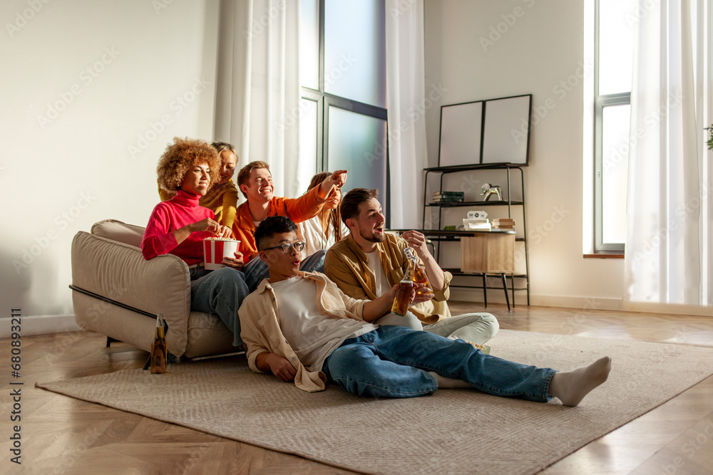 multiracial group of young friends sitting on the couch at home drinking beer and watching TV