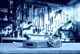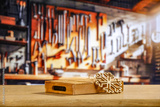 Industrial background of a Christmas workshop. Santa's home and the place where he creates gifts for children. Wooden table and decoration. Blurry background of metal tools and machines for work.