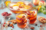 Homemade hot alcohol cranberry orange apple cider punch with cinnamon sticks, anise star and spices. Thanksgiving drink