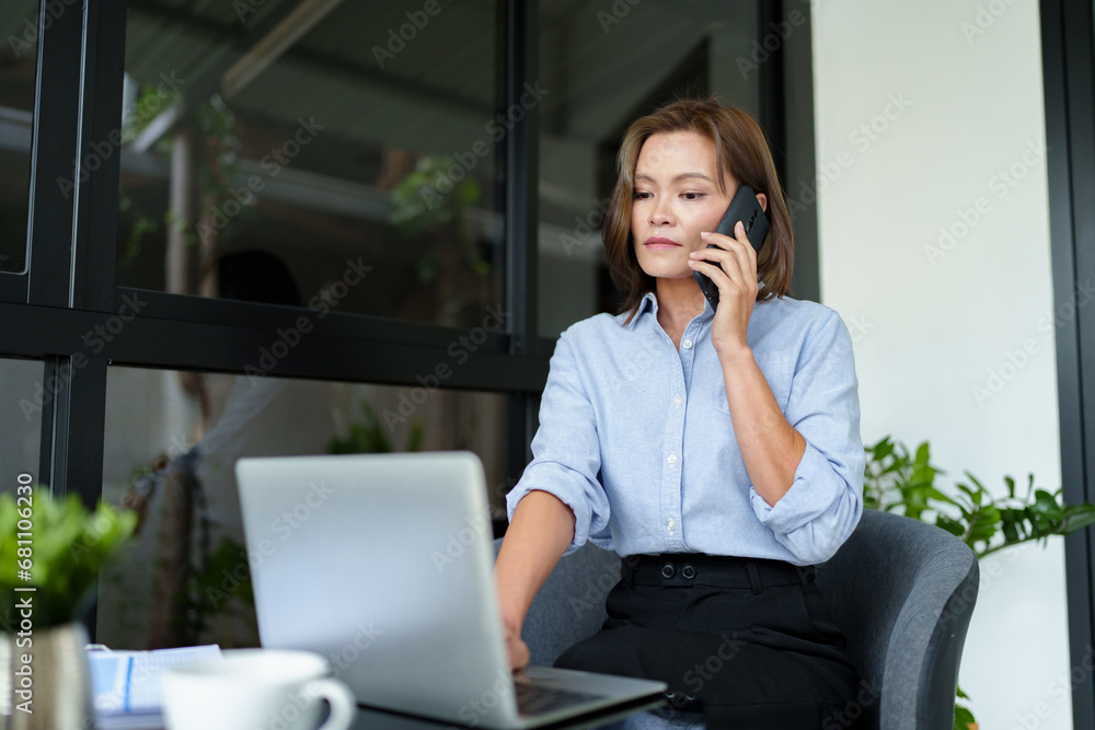 Businesswoman use cellphone to talking with colleague and taking notes while remote working.