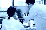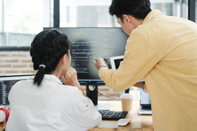 Team of young computer programmers cooperating while working on desktop PC in the office.