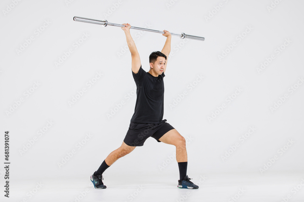 Portrait isolated cutout full body studio shot strong Asian male fitness athlete sportman model in black casual sport workout outfit posing smiling lifting barbell exercising on white background