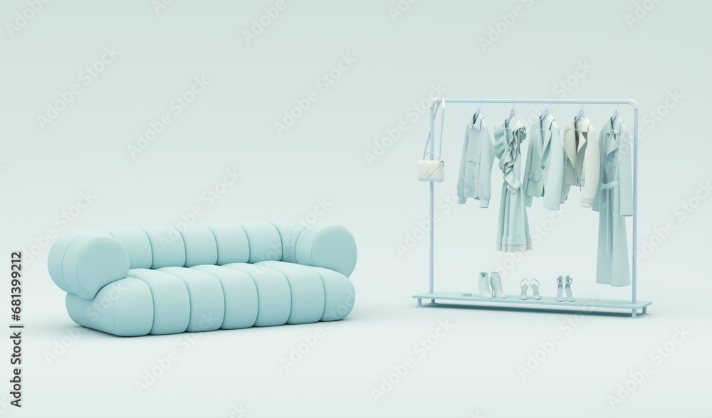 Autumn clothes hanging on a rack with armchair on pastel blue background. Mens jacket, coat, sweater, warm shirt hanging on the hangers. Creative composition.