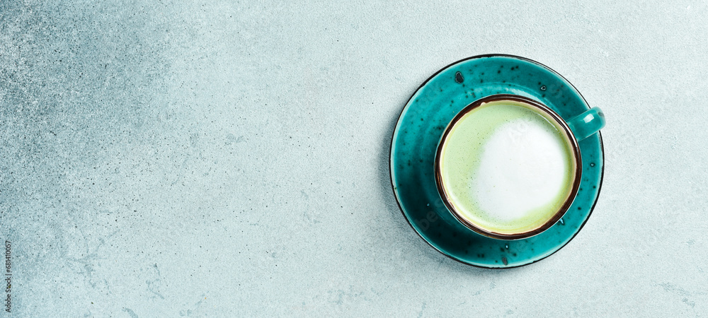 cup of delicious matcha latte on light gray background, closeup. Top view.