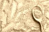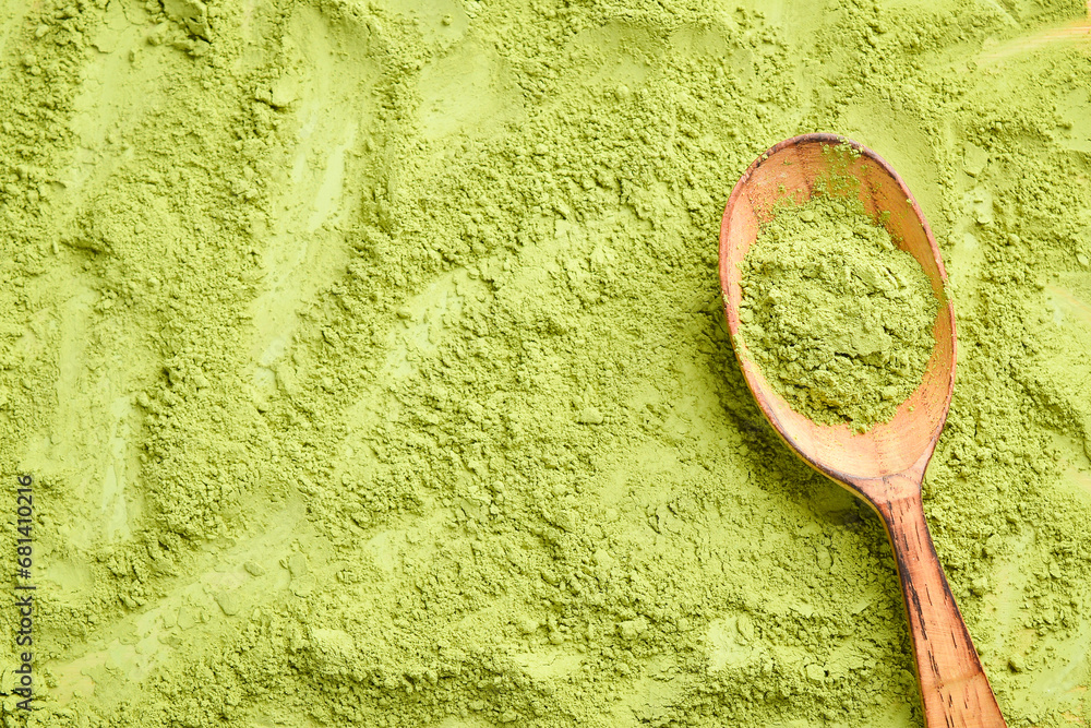 Matcha powder. Wooden spoon with matcha tea powder. Top view. Free space for text.