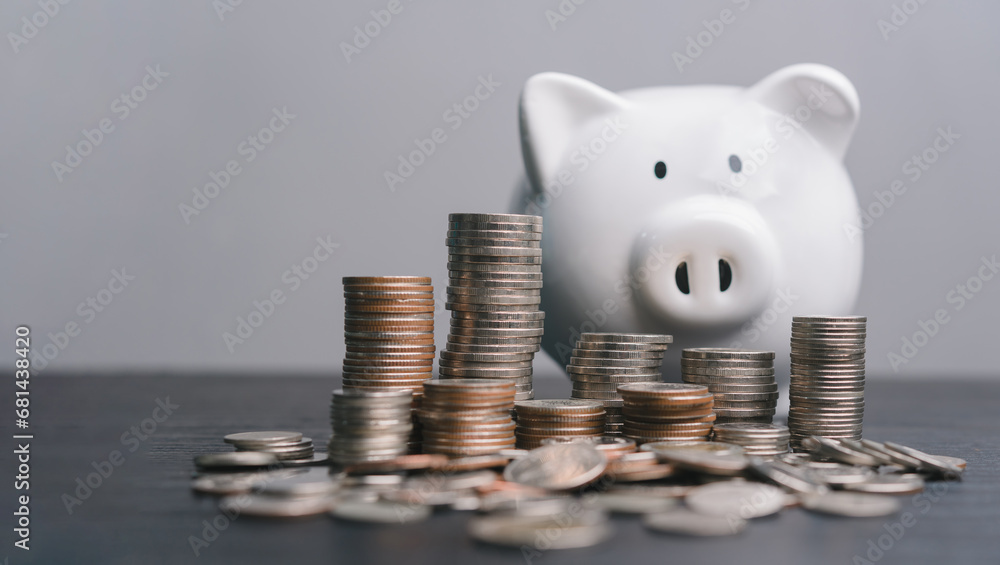 Stack coins and white piggy bank saving money business finance investment management growth and retirement fund