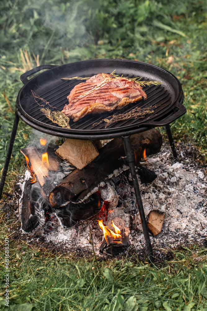 meat steak. Fresh raw Prime Black Angus beef steak cooking on flaming grill with smoke